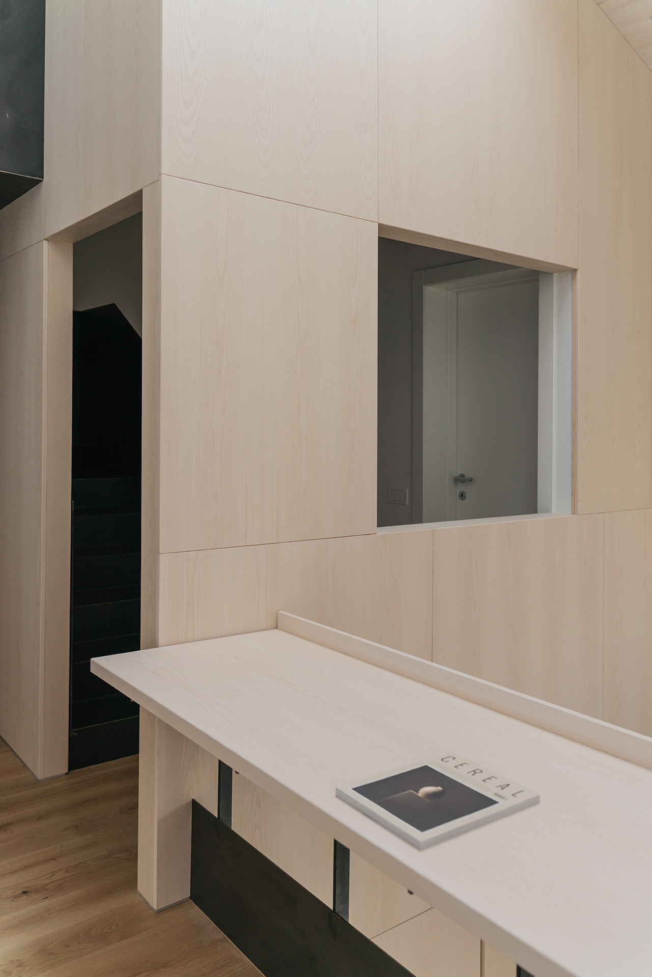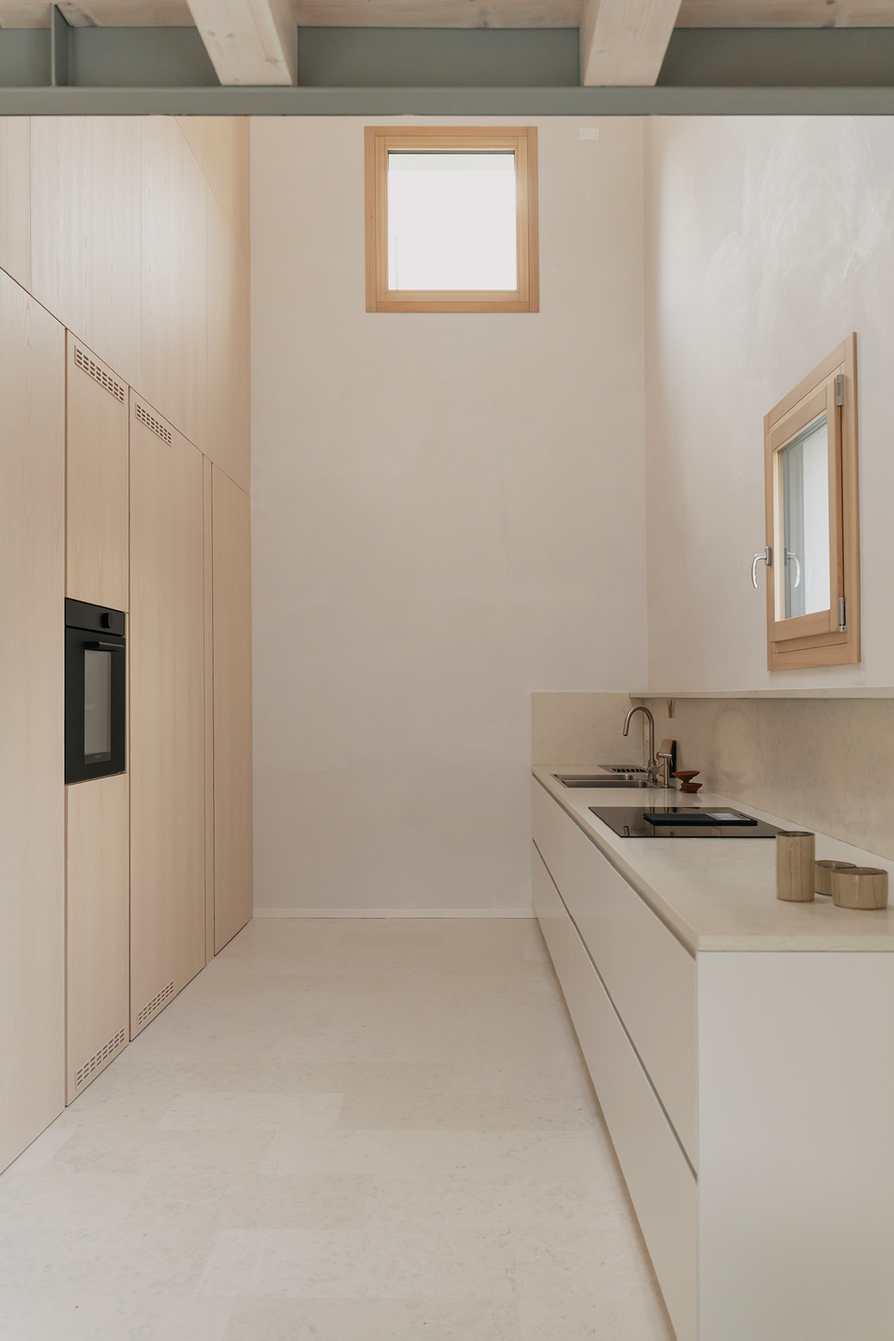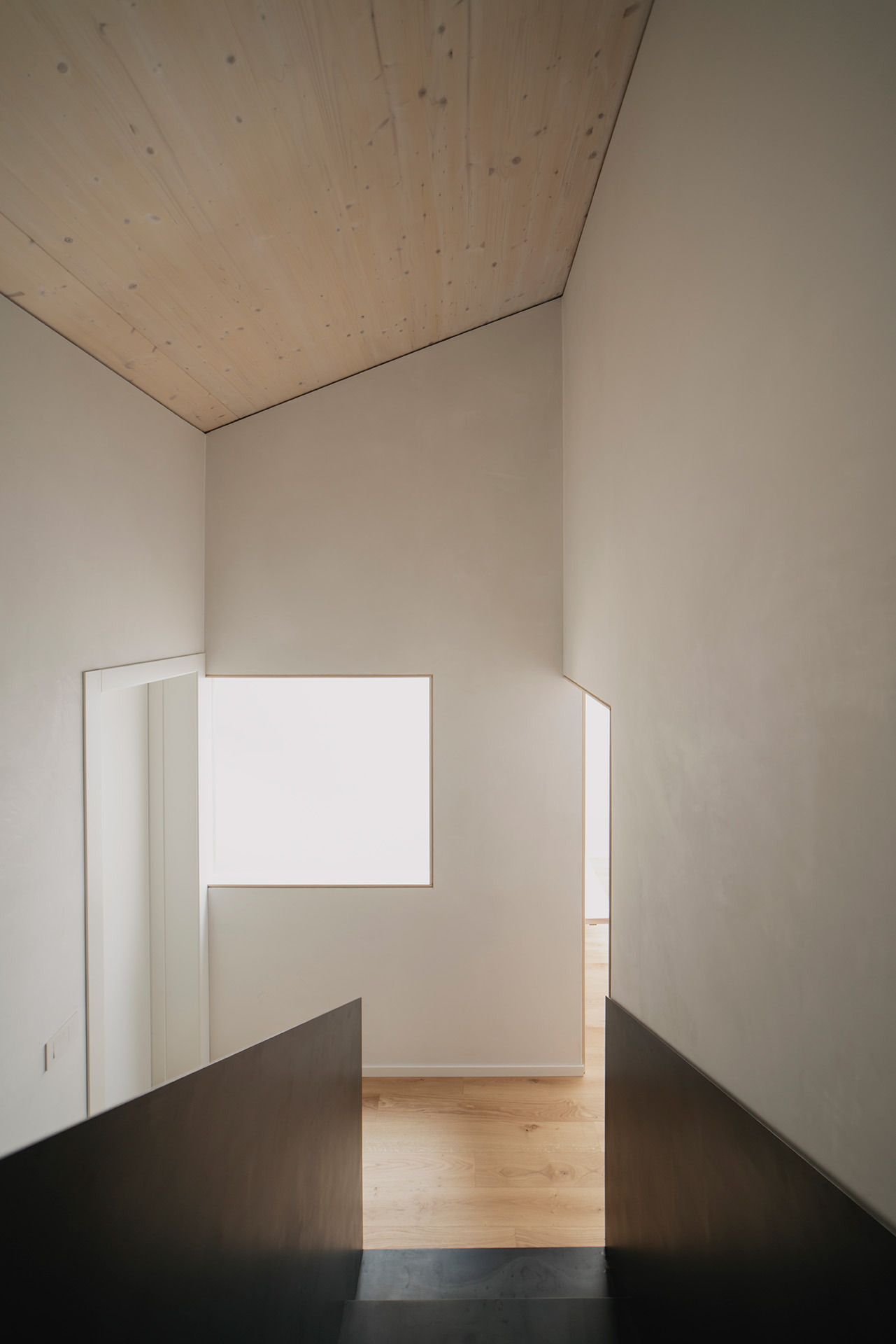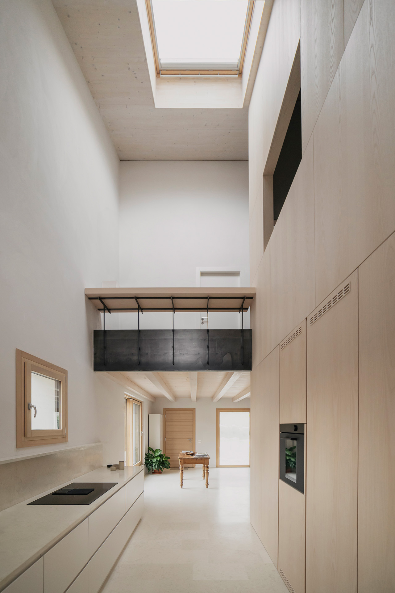Nonostante i condizionamenti dell’intorno, la sfida progettuale é stata proprio quella di portare elementi naturali come l’aria e la luce in ogni spazio della casa mediante l’introduzione di una torre vuota che connetta il piano terra al cielo e permette allo stesso tempo l’entrata della luce e la circolazione naturale dell’aria a tutti gli spazi grazie ad un grande lucernario. Contrariamente alla comune logica del ‘più è meglio’, il progetto rinuncia alla costruzioni di due solai per creare uno spazio vuoto, che diventa l’elemento chiave dell’intera soluzione progettuale. Alla base di questo vuoto si trova la cucina, che occupa un quarto della pianta pressoché quadrata, ed é contrapposto da una torre di servizi, costituiti da due bagni e dalle scale. Da questo nucleo verticale pieno in legno di frassino si snodano due ballatoi che consentono l’accesso alle tre camere.