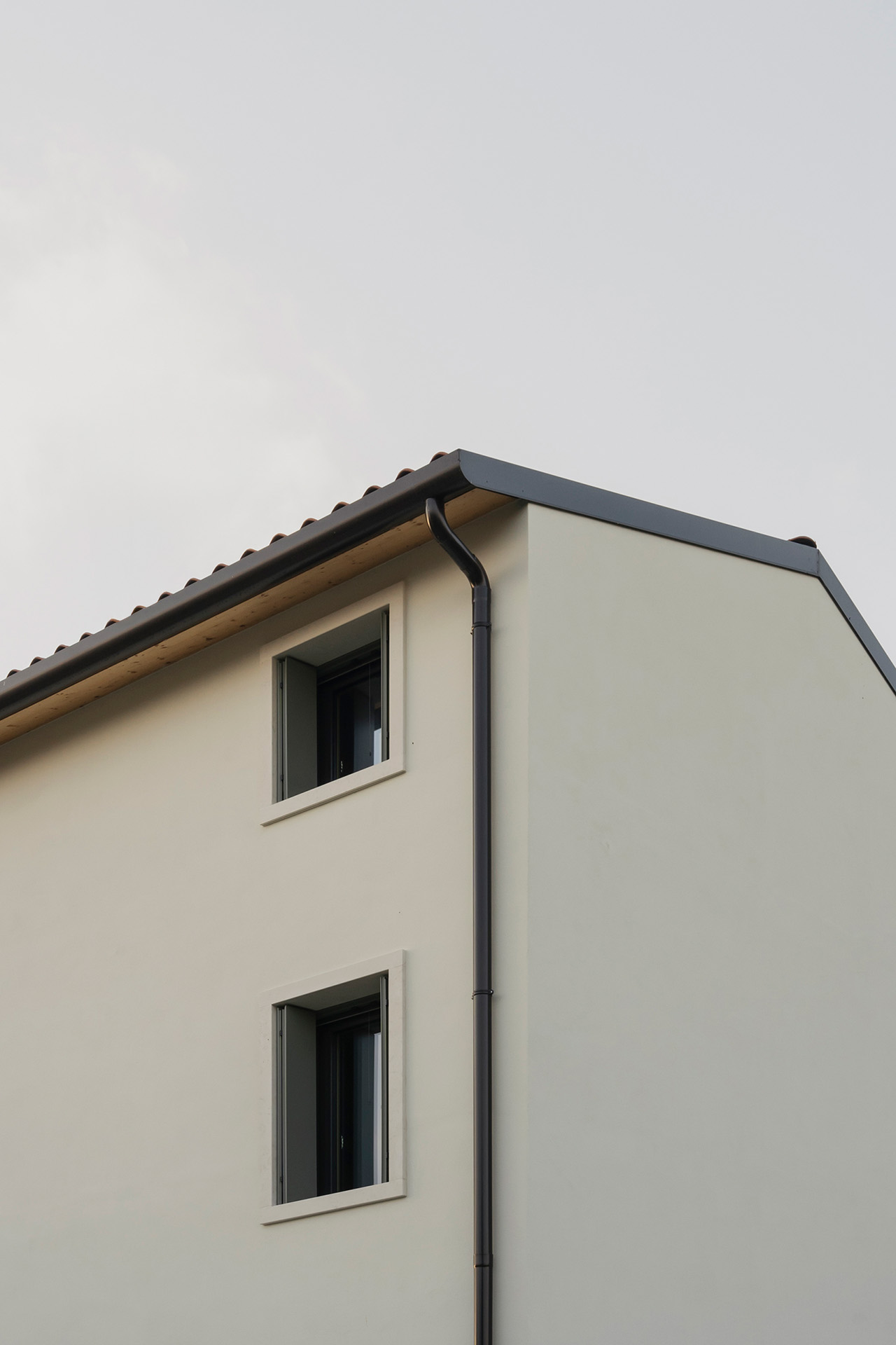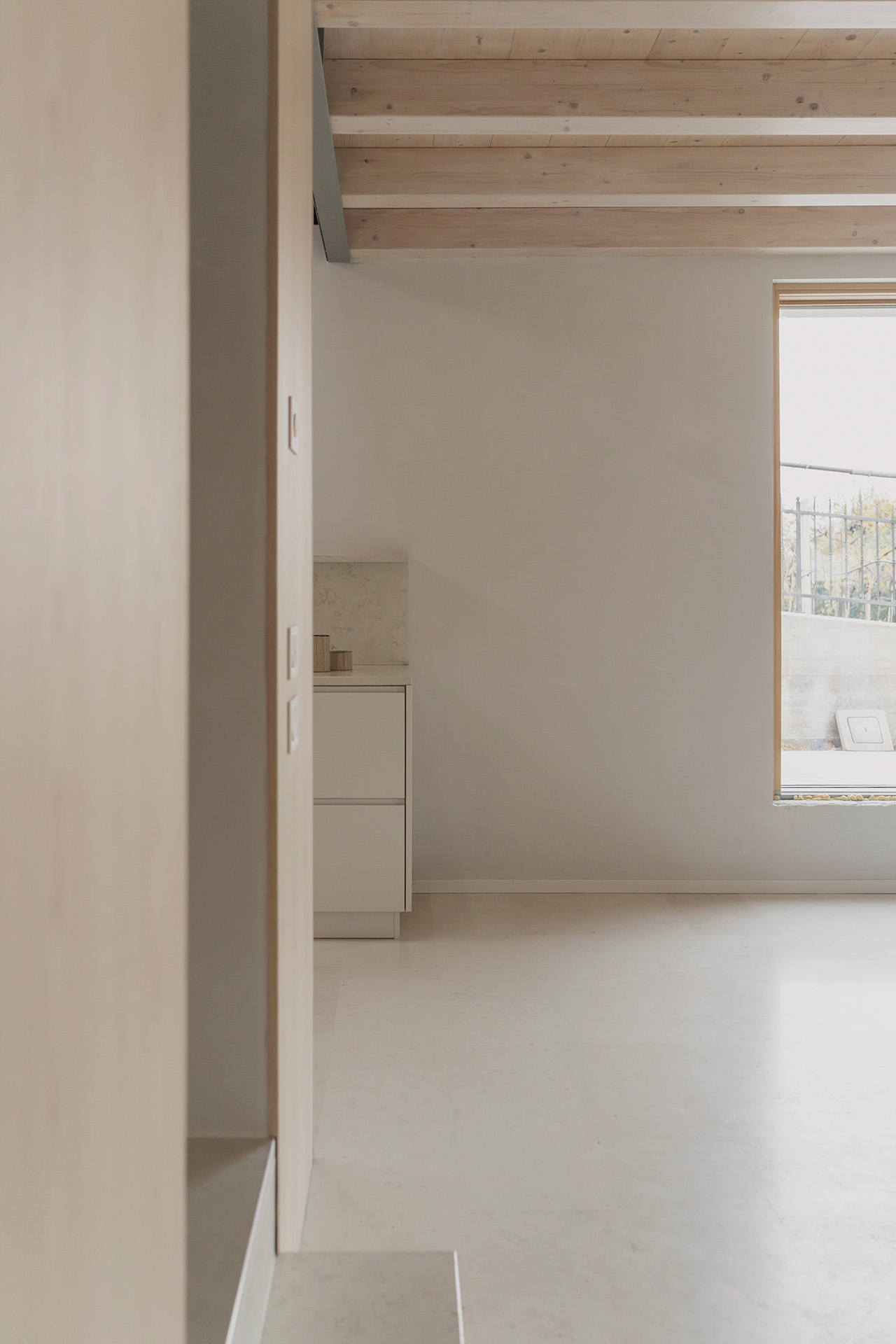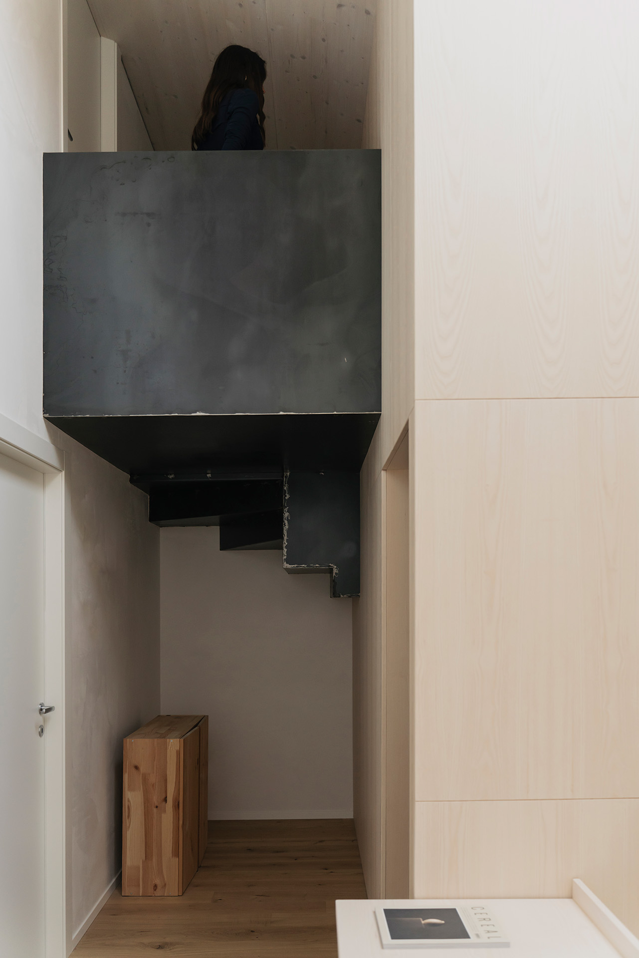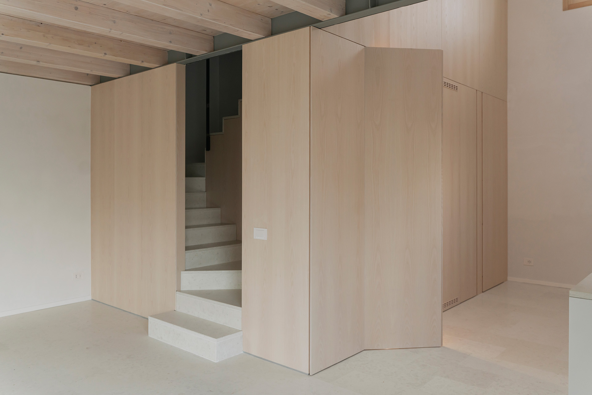 Nonostante i condizionamenti dell’intorno, la sfida progettuale é stata proprio quella di portare elementi naturali come l’aria e la luce in ogni spazio della casa mediante l’introduzione di una torre vuota che connetta il piano terra al cielo e permette allo stesso tempo l’entrata della luce e la circolazione naturale dell’aria a tutti gli spazi grazie ad un grande lucernario. Contrariamente alla comune logica del ‘più è meglio’, il progetto rinuncia alla costruzioni di due solai per creare uno spazio vuoto, che diventa l’elemento chiave dell’intera soluzione progettuale. Alla base di questo vuoto si trova la cucina, che occupa un quarto della pianta pressoché quadrata, ed é contrapposto da una torre di servizi, costituiti da due bagni e dalle scale. Da questo nucleo verticale pieno in legno di frassino si snodano due ballatoi che consentono l’accesso alle tre camere.