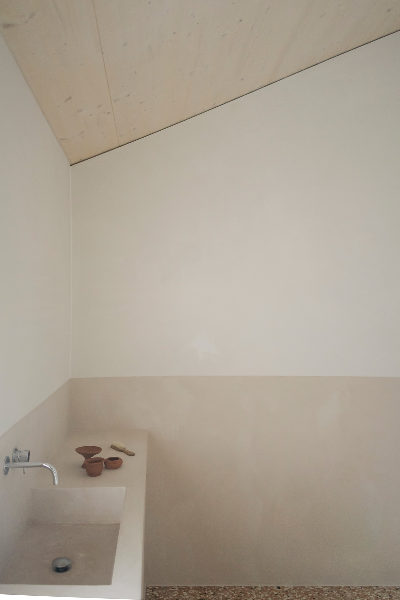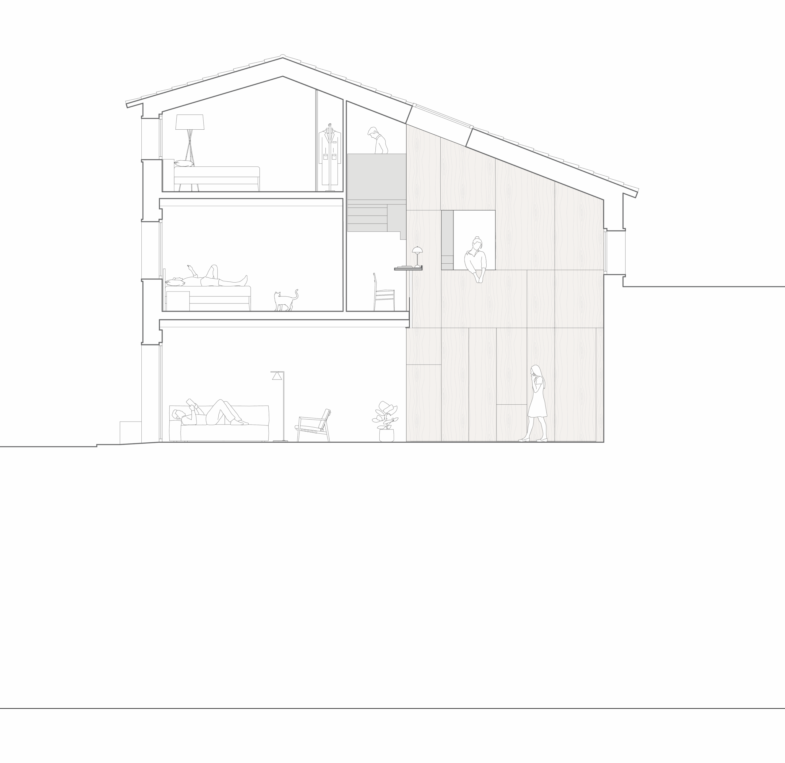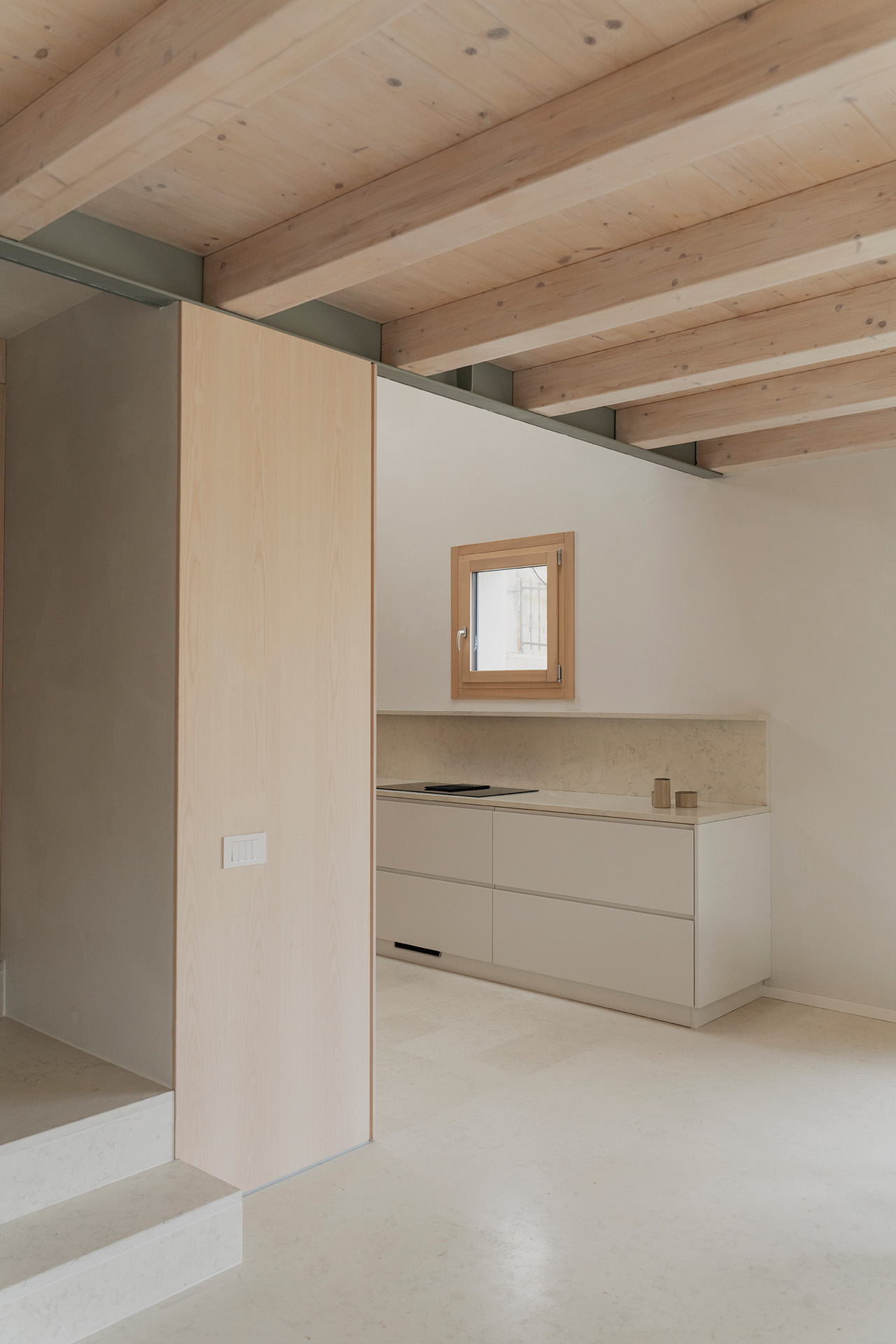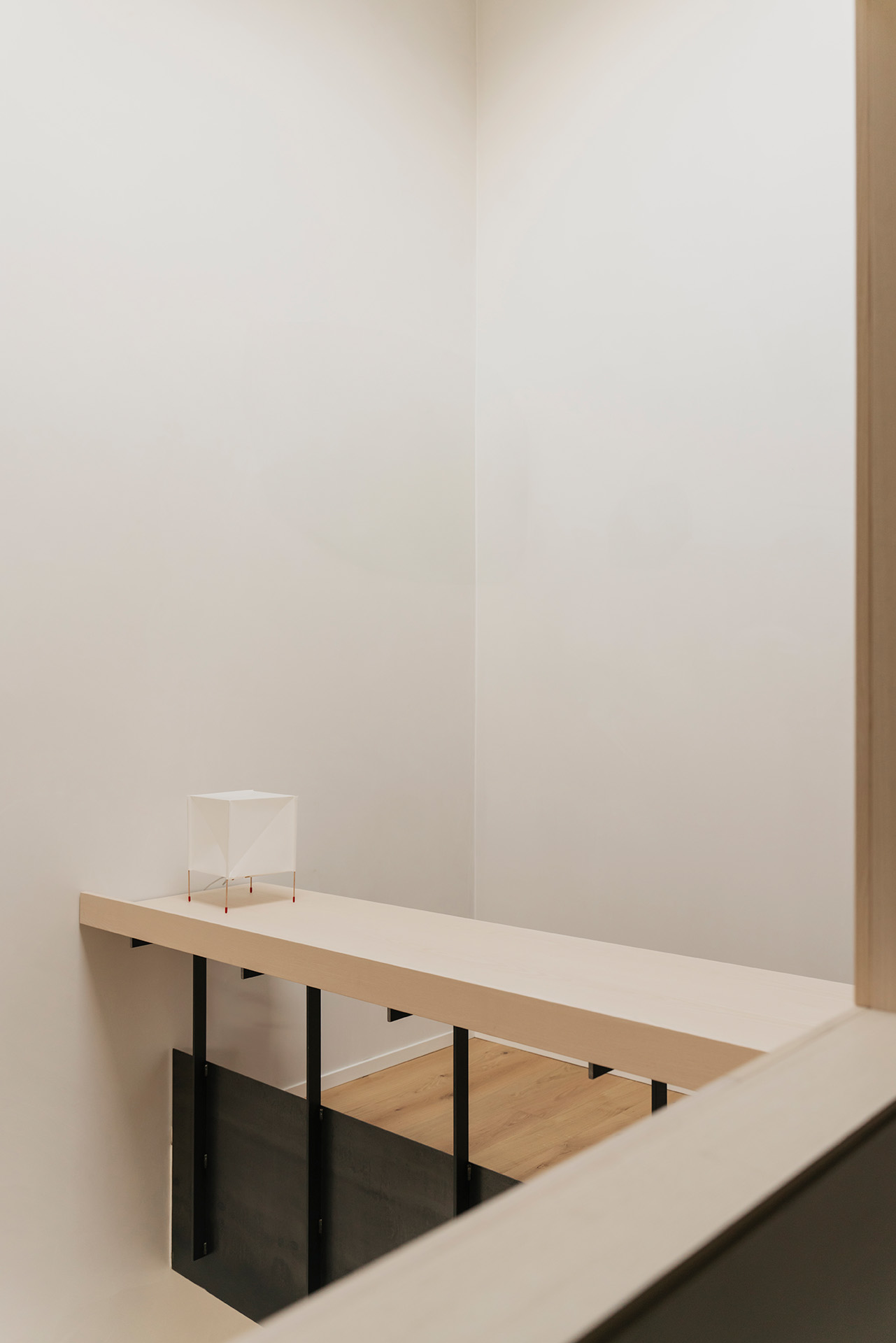 Nonostante i condizionamenti dell’intorno, la sfida progettuale é stata proprio quella di portare elementi naturali come l’aria e la luce in ogni spazio della casa mediante l’introduzione di una torre vuota che connetta il piano terra al cielo e permette allo stesso tempo l’entrata della luce e la circolazione naturale dell’aria a tutti gli spazi grazie ad un grande lucernario. Contrariamente alla comune logica del ‘più è meglio’, il progetto rinuncia alla costruzioni di due solai per creare uno spazio vuoto, che diventa l’elemento chiave dell’intera soluzione progettuale. Alla base di questo vuoto si trova la cucina, che occupa un quarto della pianta pressoché quadrata, ed é contrapposto da una torre di servizi, costituiti da due bagni e dalle scale. Da questo nucleo verticale pieno in legno di frassino si snodano due ballatoi che consentono l’accesso alle tre camere.