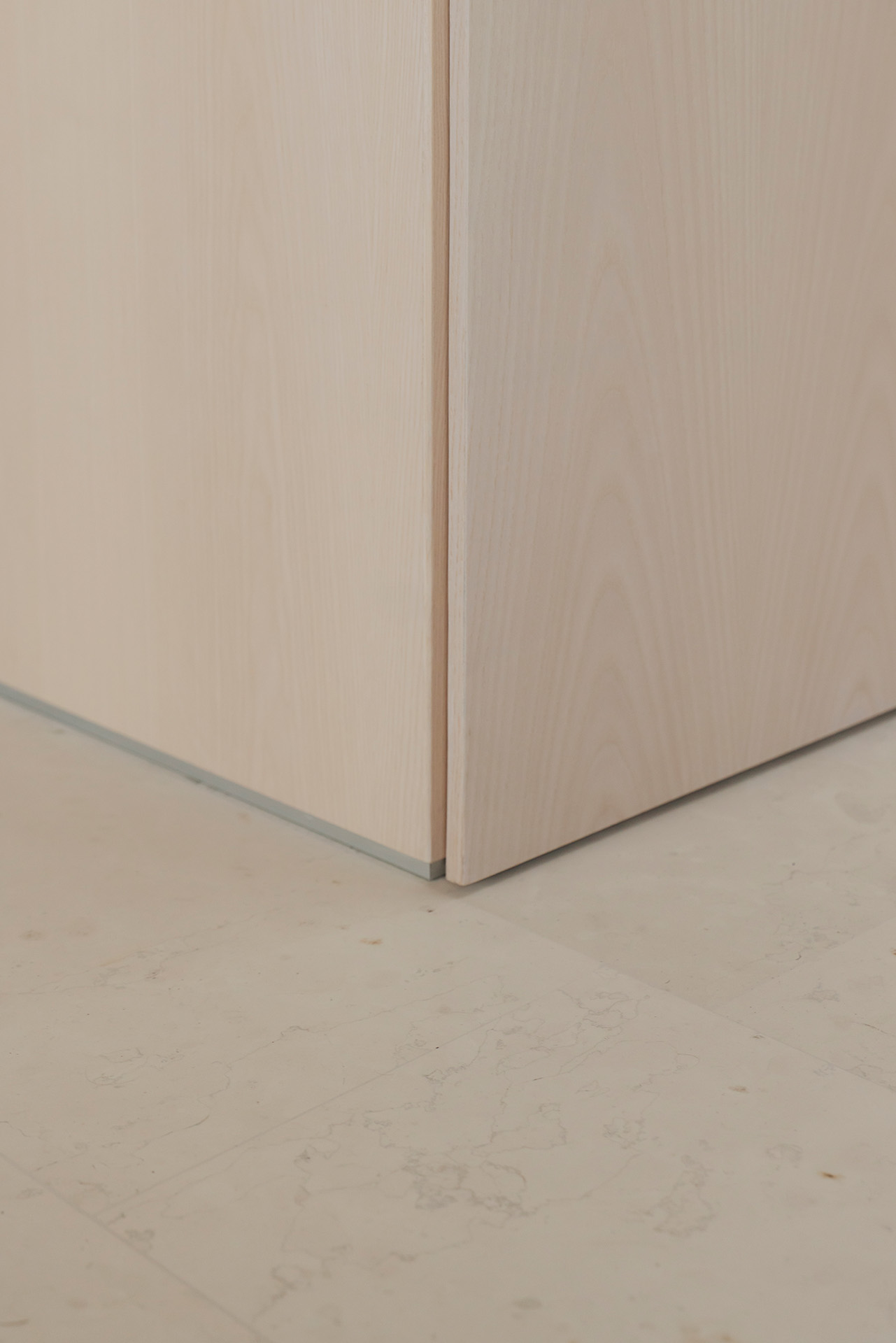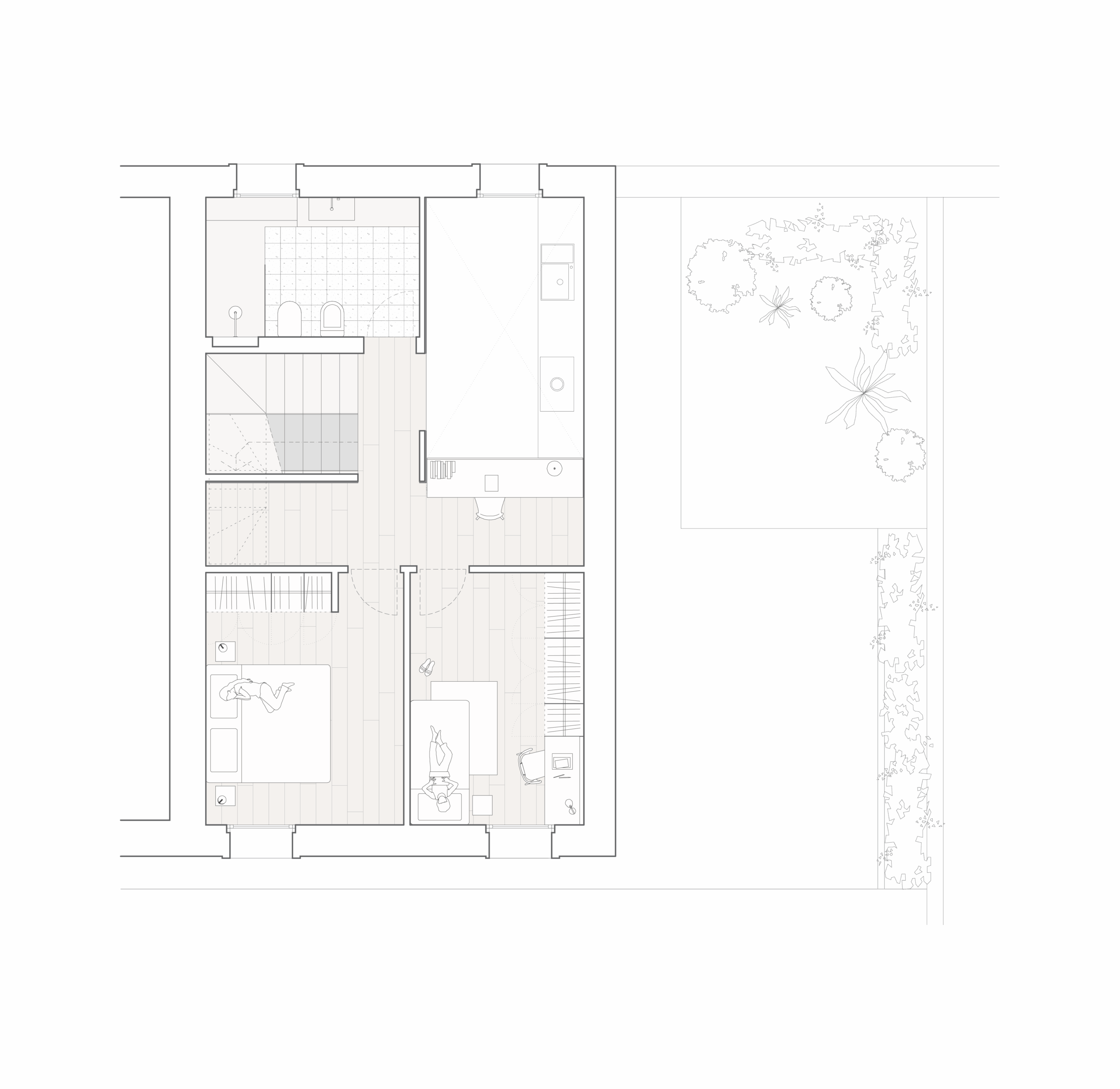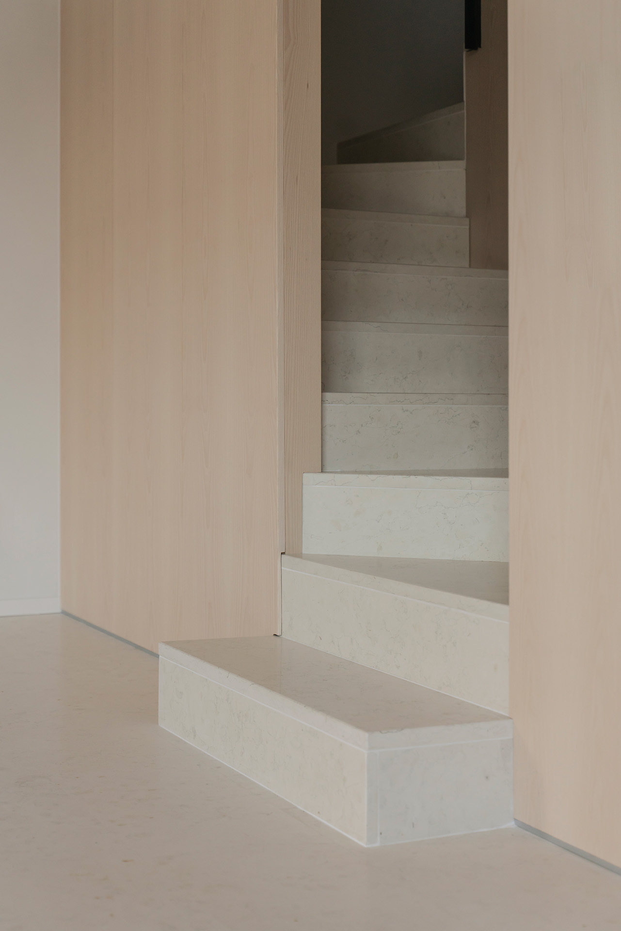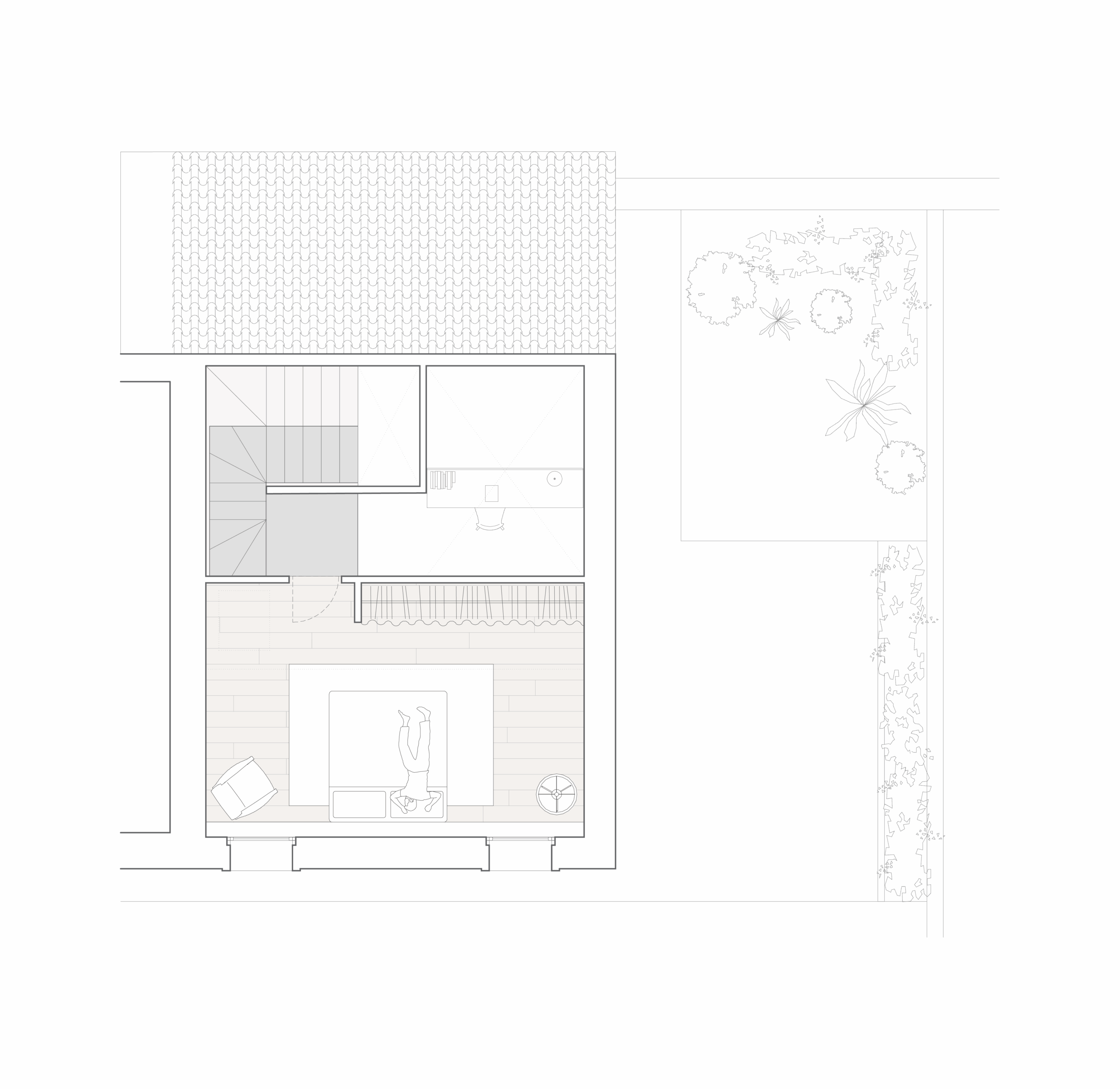Nonostante i condizionamenti dell’intorno, la sfida progettuale é stata proprio quella di portare elementi naturali come l’aria e la luce in ogni spazio della casa mediante l’introduzione di una torre vuota che connetta il piano terra al cielo e permette allo stesso tempo l’entrata della luce e la circolazione naturale dell’aria a tutti gli spazi grazie ad un grande lucernario. Contrariamente alla comune logica del ‘più è meglio’, il progetto rinuncia alla costruzioni di due solai per creare uno spazio vuoto, che diventa l’elemento chiave dell’intera soluzione progettuale. Alla base di questo vuoto si trova la cucina, che occupa un quarto della pianta pressoché quadrata, ed é contrapposto da una torre di servizi, costituiti da due bagni e dalle scale. Da questo nucleo verticale pieno in legno di frassino si snodano due ballatoi che consentono l’accesso alle tre camere.
