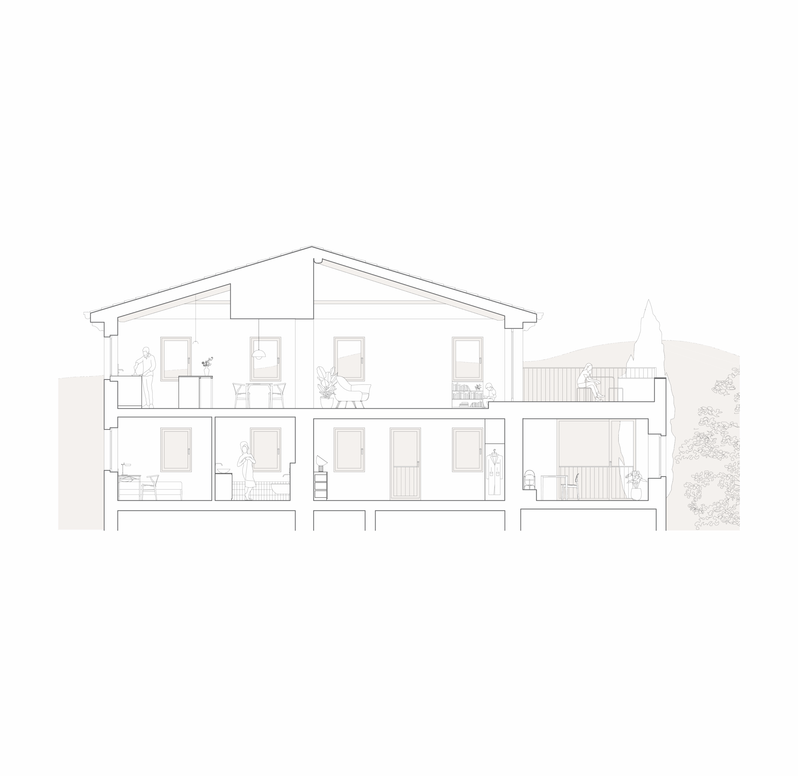 La prima sfida progettuale é stata proprio quella di sovvertire la logica: il centro distante dalle viste è stato occupato da armadiature e spazi di servizio e sul perimetro esposto alla valle sono stati progettati gli spazi serviti. Per fare ció é stato necessario demolire quasi tutte le divisioni verticali realizzando puntualmente degli interventi strutturali.