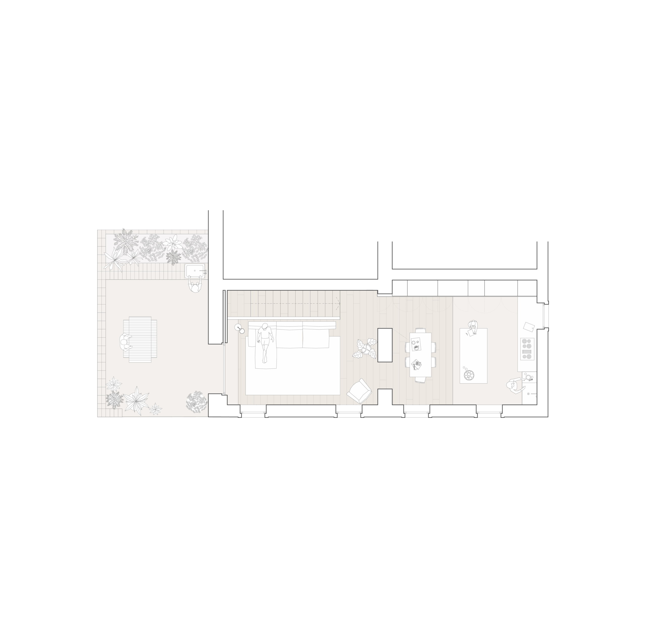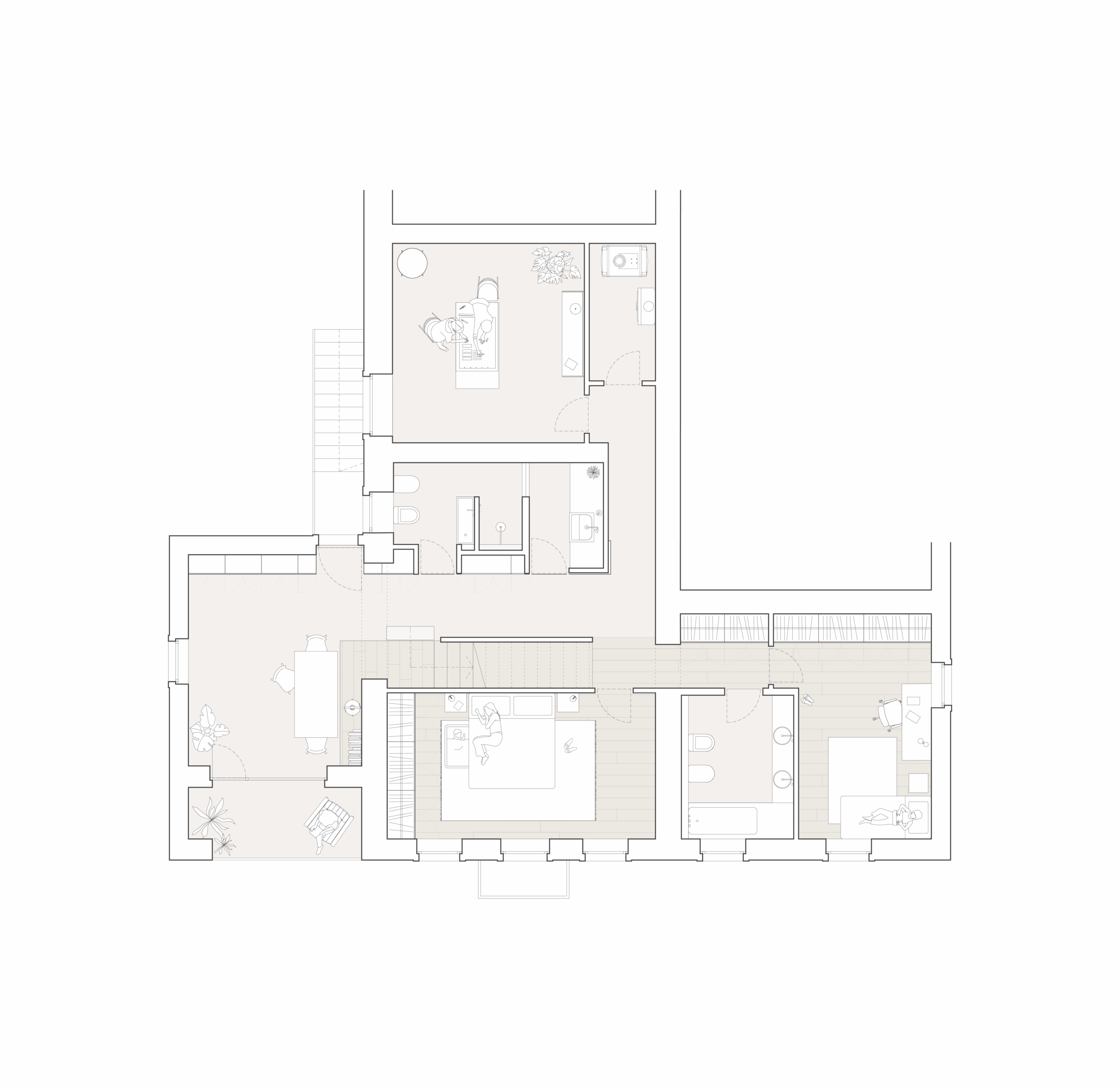 Per esaltare al massimo la posizione privilegiata dell’appartamento si é deciso di invertire la comune tendenza di posizionare la zona giorno al piano inferiore e la zona notte al piano superiore. Il progetto, infatti, vede all’ultimo piano la sequenza dei tre spazi piú vissuti della casa, la cucina, il soggiorno ed una nuova grande terrazza, invece al piano inferiore si trovano un ampio ingresso, le camere, un blocco servizi e un laboratorio creativo.